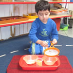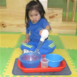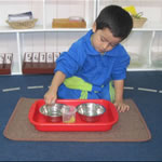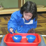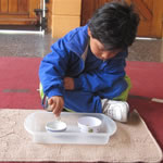 Nuestra siguiente lección se trata de presentarle al niño dos recipientes: el de la izquierda con gemas de colores y el otro vacio, la faena consistirá en pasar con una cuchara los elementos de uno en uno y de izquierda a derecha. Luego podemos cambiar las gemas por piedras, semillas, etc. Además de los objetivos antes mencionados trabajamos el equilibrio de la motricidad fina. |